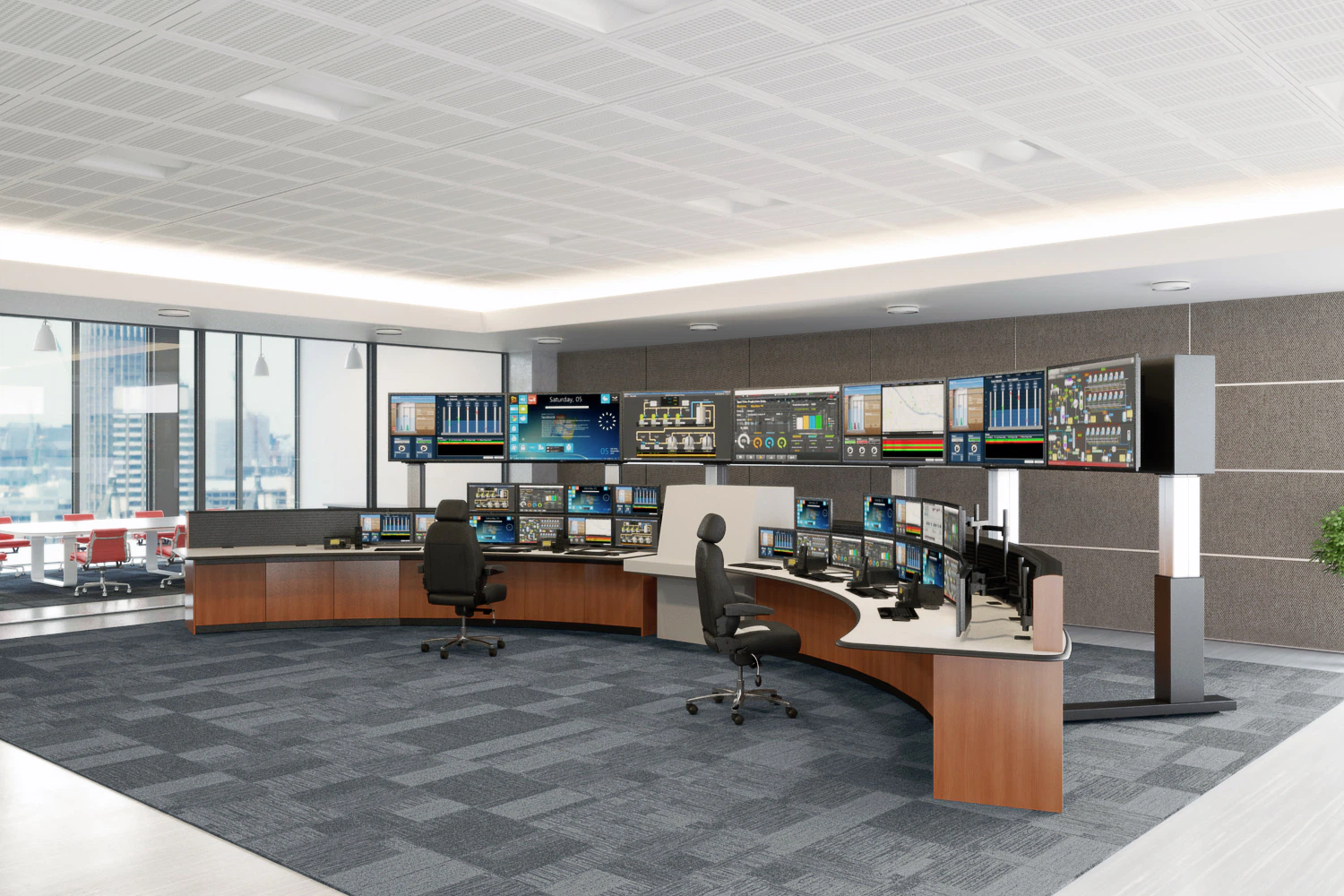 In a collaborative work environment, operators need to communicate round the clock and be able to work together effortlessly. A control room setup like this entails workstation layouts that foster a natural flow of information. This setup is common in industries such as power distribution centers, network operations centers, and emergency response centers.