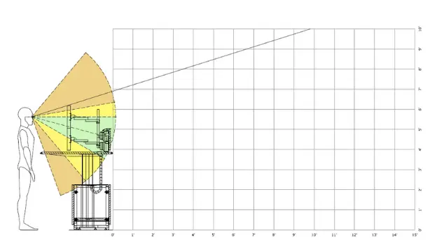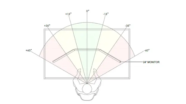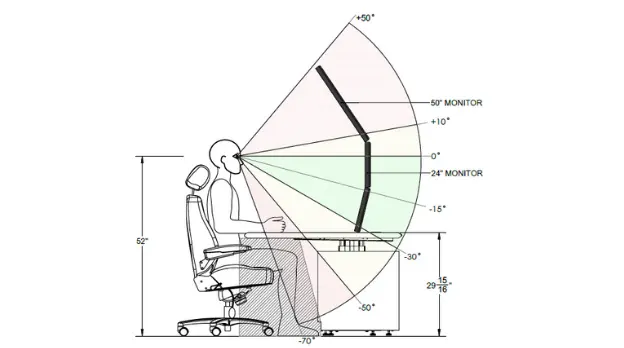 The image above shows normal line of sight for an operator in a normal and relaxed posture while sitting at a Tresco console. The green zone is primary viewing area – no eye or head movement required. Yellow is secondary – eye movement with no head movement. Red is Tertiary – visual limits, head movement required.