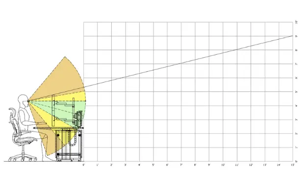 According to ISO 11064-5, the primary visual zone should extend roughly 15° above and 25° below horizontal eye level. Beyond this range, operators are forced into awkward head tilts that increase fatigue over long shifts. For distance, ISO 11064-6 recommends that large shared displays (such as a video wall) be positioned so that operators can view critical information without exceeding a 30° horizontal viewing angle from their seated position. In practice, this often translates to video walls placed 1.5 to 4 times the screen height away from the primary viewing position, depending on resolution and font size.